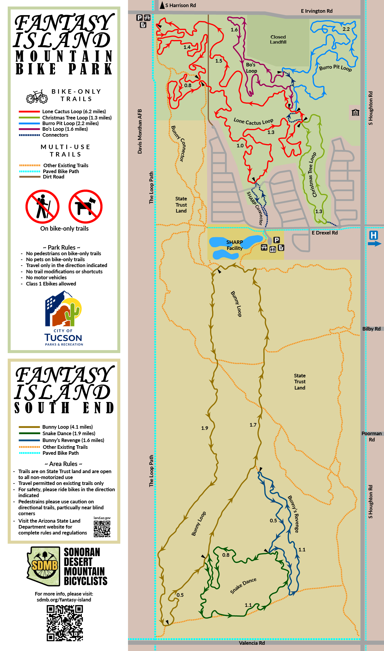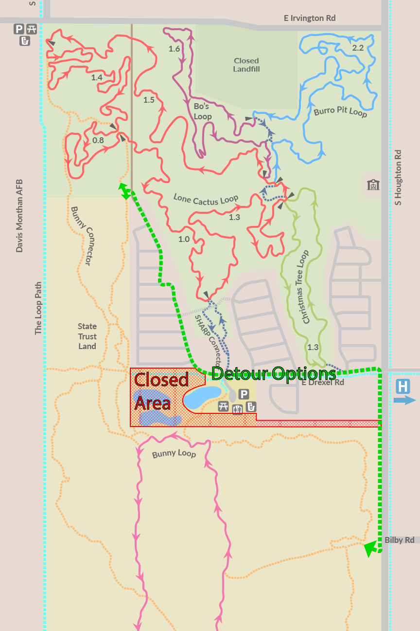 Rider Alert: Tucson Water has begun construction of a 4th recharge basin at the SHARP facility. Unfortunately, this requires the closure of some commonly used access points for the Bunny trails and Loop path. We're working with the local neighborhood association on a more direct detour, but for now these are the best options we have. The project is scheduled to be completed Spring 2026, and all access points will be restored. The Tucson Water SHARP webpage may have additional information.